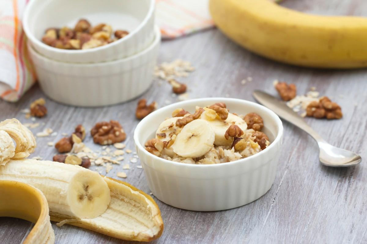 Este bocadillo saludable es fácil para el estómago, y cuando se combina con una pequeña cantidad de nueces, evitarás que los niveles de azúcar en la sangre caigan a mitad del entrenamiento. Solo recuerda no consumir demasiado de este bocadillo, especialmente las nueces, ya que demoran más en digerirse.
